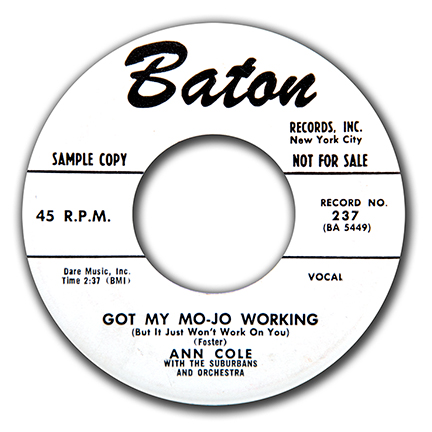 53. Ann Cole "Got My Mo-Jo Working (But It Just Won't Work On You)/I've Got A Little Boy" BATON 237 M- WHITE LABEL PROMO and THIS is where Muddy Waters learned the song! He did NOT write it or sing it first. MB $75