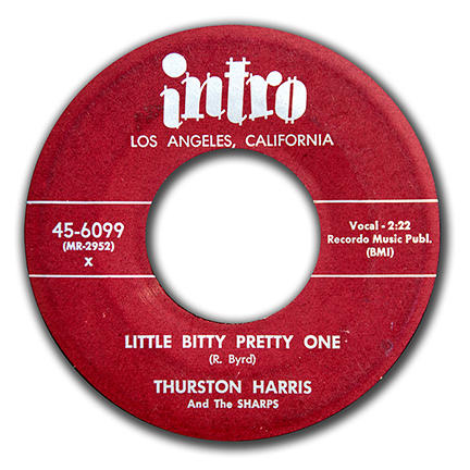 your copy doesn't look like this, you don't have an original. MB $25 187. Jimmy Hannan (backing vocals by The Bee Gees) "You Gotta Have Love/Beach Ball" ATLANTIC 2247 M- White label promo MB $25 188. Thurston Harris And The Sharps "Little Bitty Pretty One/I Hope You Won't Hold It Against Me" INTRO 6099 VG+ TRUE FIRST LABEL, FIRST PRESSING before it hit big on ALADDIN. I